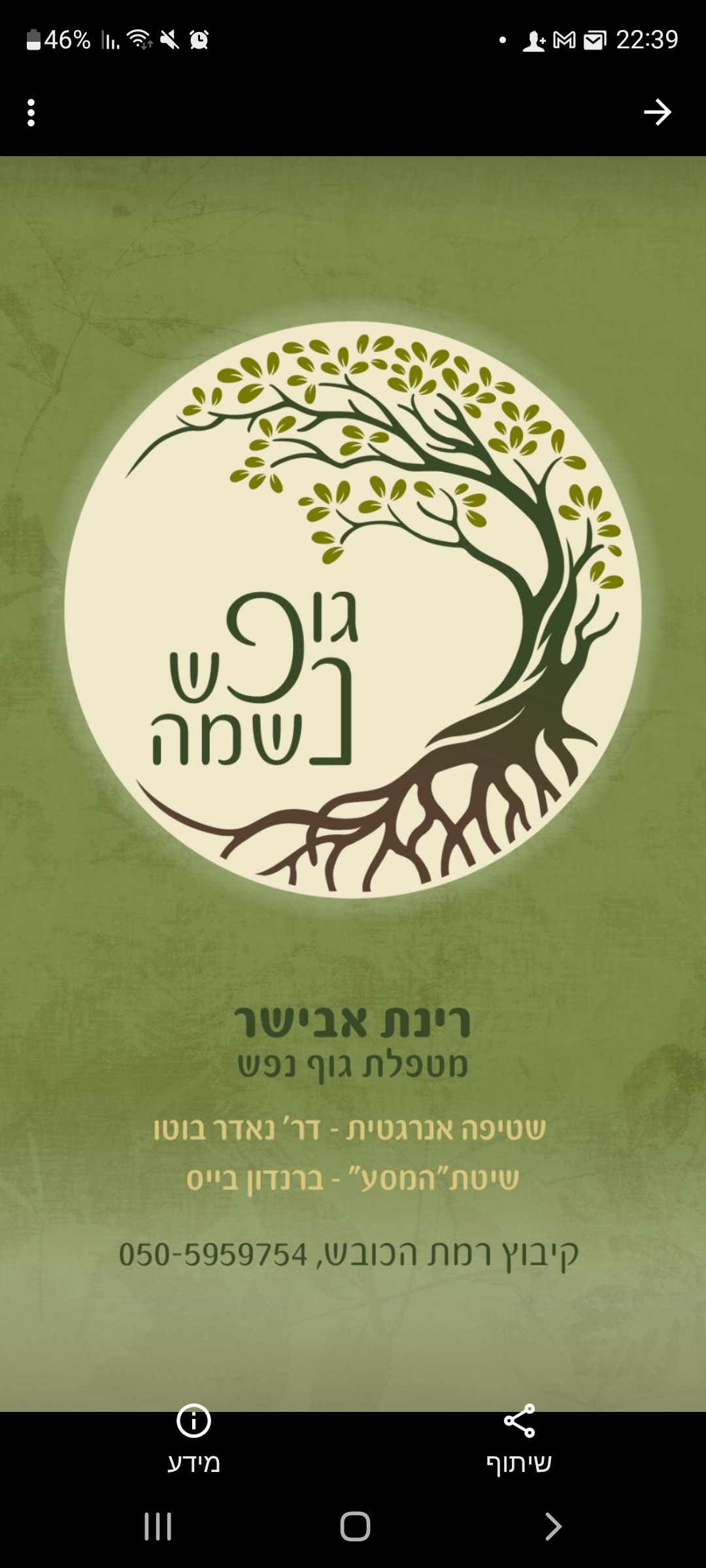 רינת אבישר מטפלת מוסמכת ברפואה אינטגרטיבית מאחדת (שטיפה אנרגטית) של דר' נאדר בוטו ובשיטת "המסע" של ברנדון בייס
